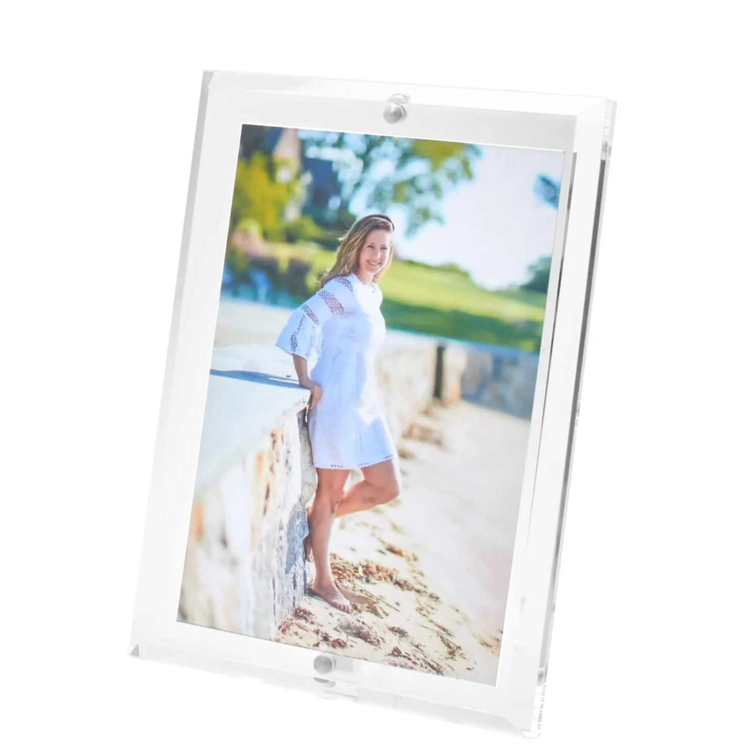 Details: clear lucite, beveled front, built in magnets for easy assembly, kickstand orients the frame vertically or horizontally.