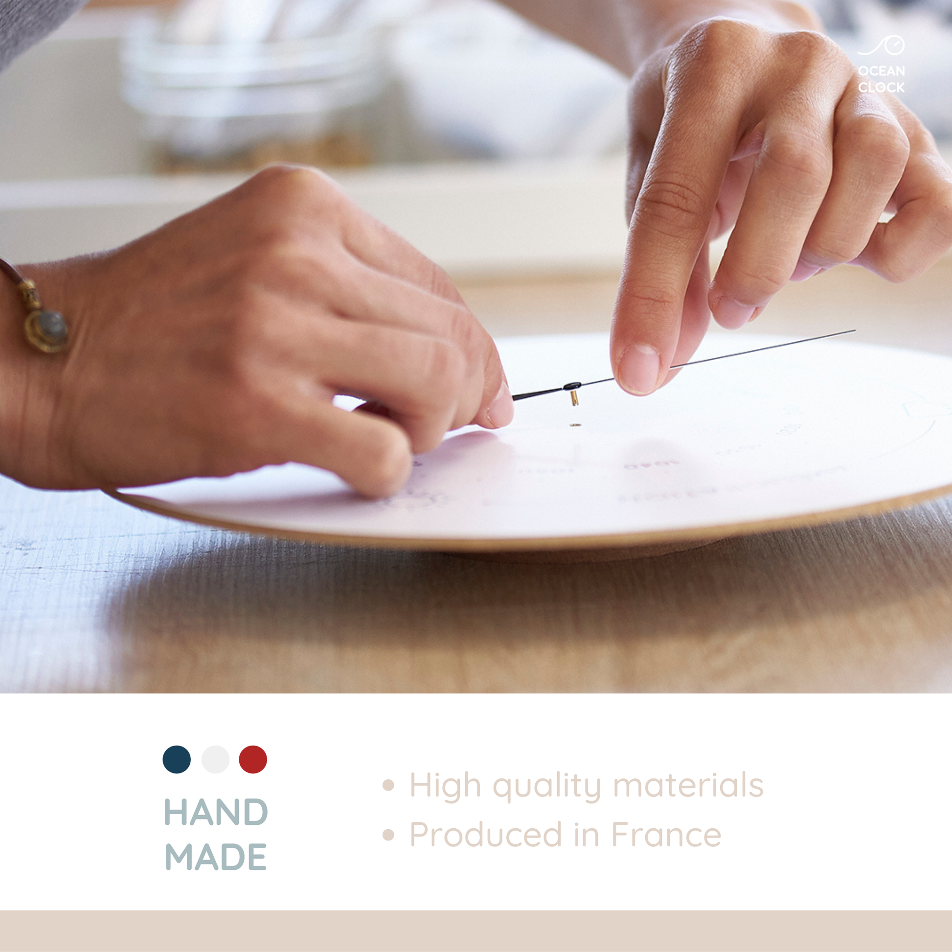 What will the color of the sky be today? Want to master the weather? Choose our Marine barometer. With its sleek design in white and navy blue, this barometer allows you to forecast the weather at a glance. The modern and original decorative accessory to enhance your interior! Hand-assembled in Hossegor, with a natural beech wood frame, a black needle, and a magnetic lightning bolt in beech wood. By measuring atmospheric pressure variations, the barometer forecasts the weather for the next 12 to 24 hours. Accuracy +/- 3 hpa Not recommended for use above 450 m altitude.