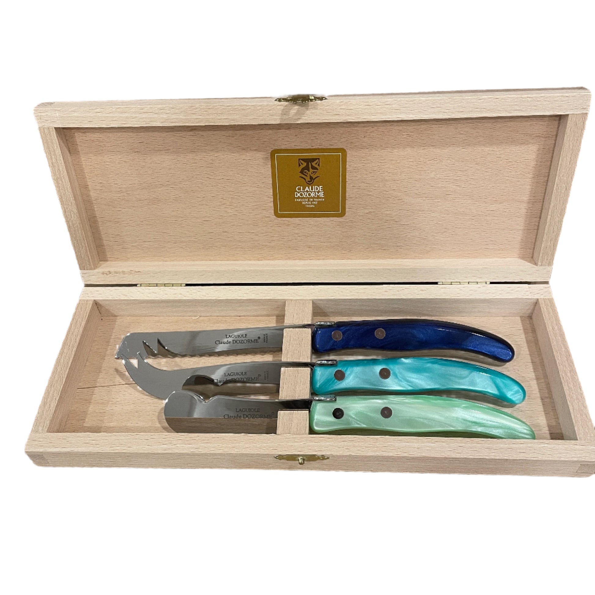 A set of three knives in an ocean toned, cool color palette. Knives include a serrated tomato knife, cheese knife, and spreader. Exact colors may vary. More colors are available in store - for consultation for a custom box, please give us a call at 781-990-5621.