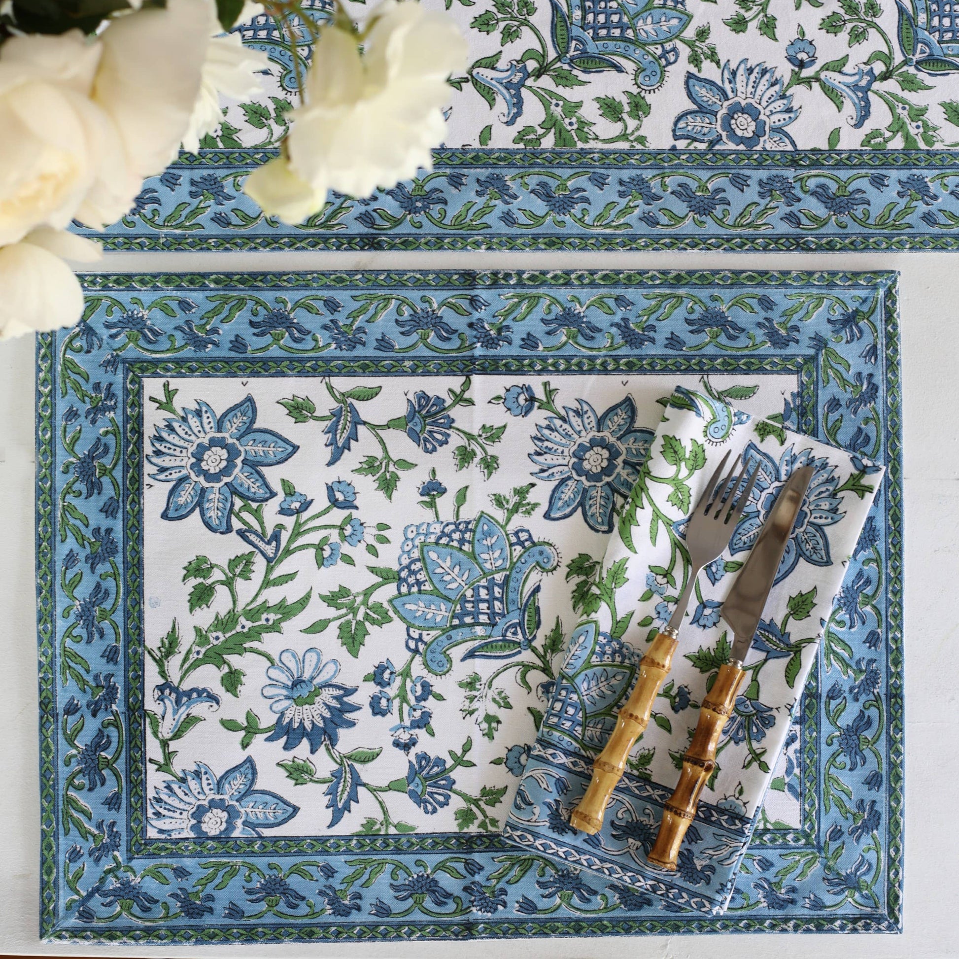 Printed by hand in Rajasthan, India by traditional craftsmen using hand-carved teak blocks on cotton canvas. 14"x18", Set of 4