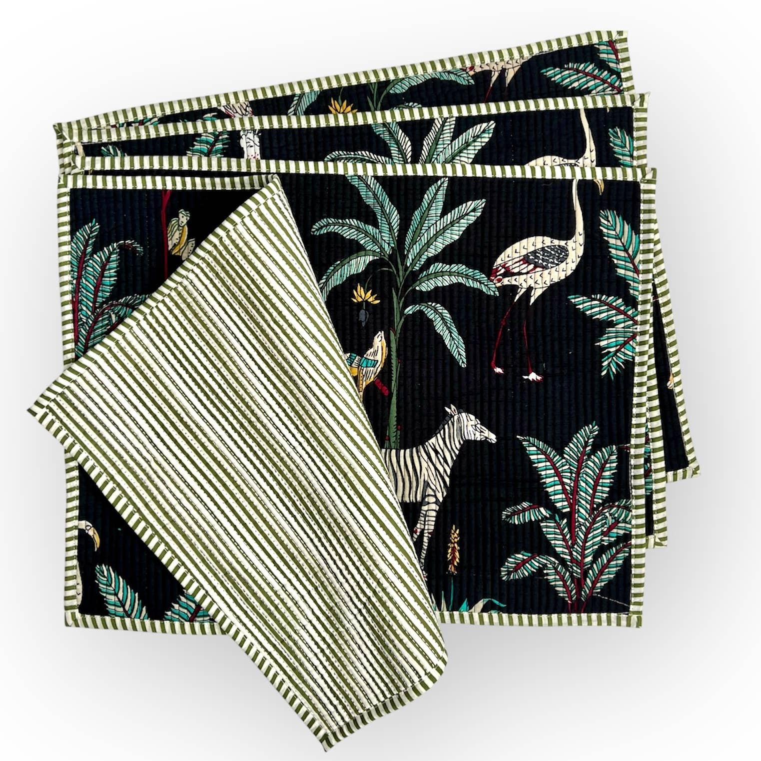 Transform your dining into a tropical escape with our Jungle-Inspired Quilted Placemats. Featuring lush, exotic designs paired with a chic striped trim and stripe reversible backing, these placemats are perfect for bringing a touch of nature to your table.