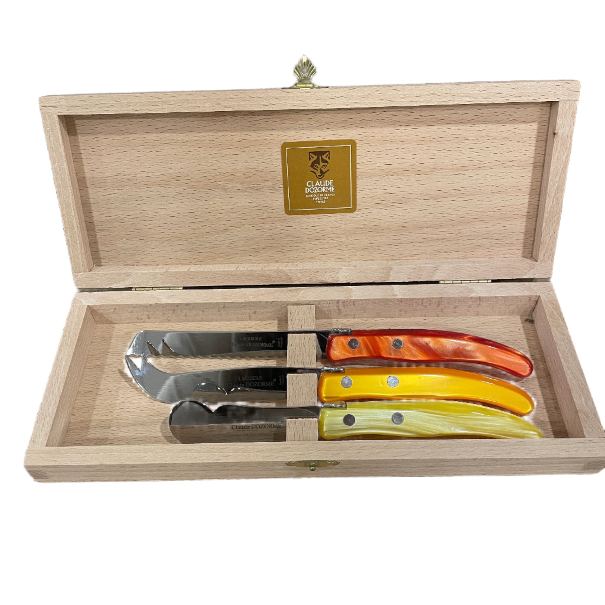 A set of three knives in a sunset, warm color palette. Knives include a serrated tomato knife, cheese knife, and spreader. Exact colors may vary. More colors are available in store - for consultation for a custom box, please give us a call at 781-990-5621.