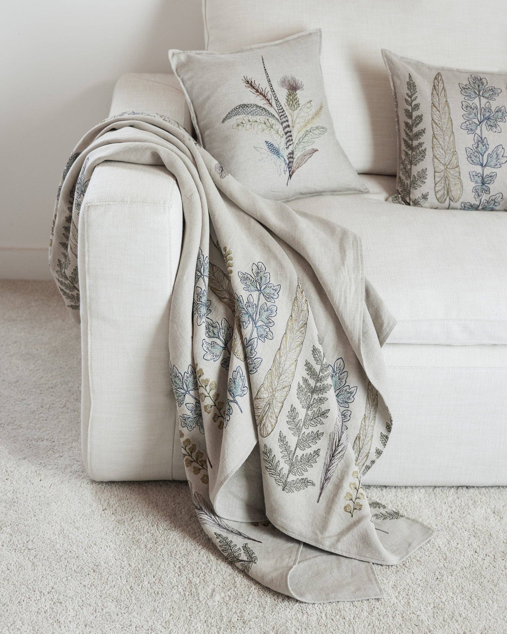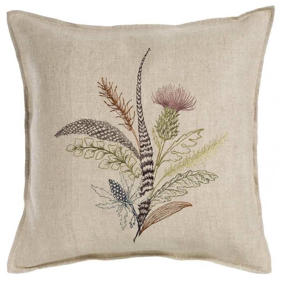 A bouquet of gathered thistles, greenery and feathers. A bundle of unlikely components, our Thistle pillow adds an elegant seasonal touch with its subdued color palette. Pairs with our Plants Lumbar pillow.