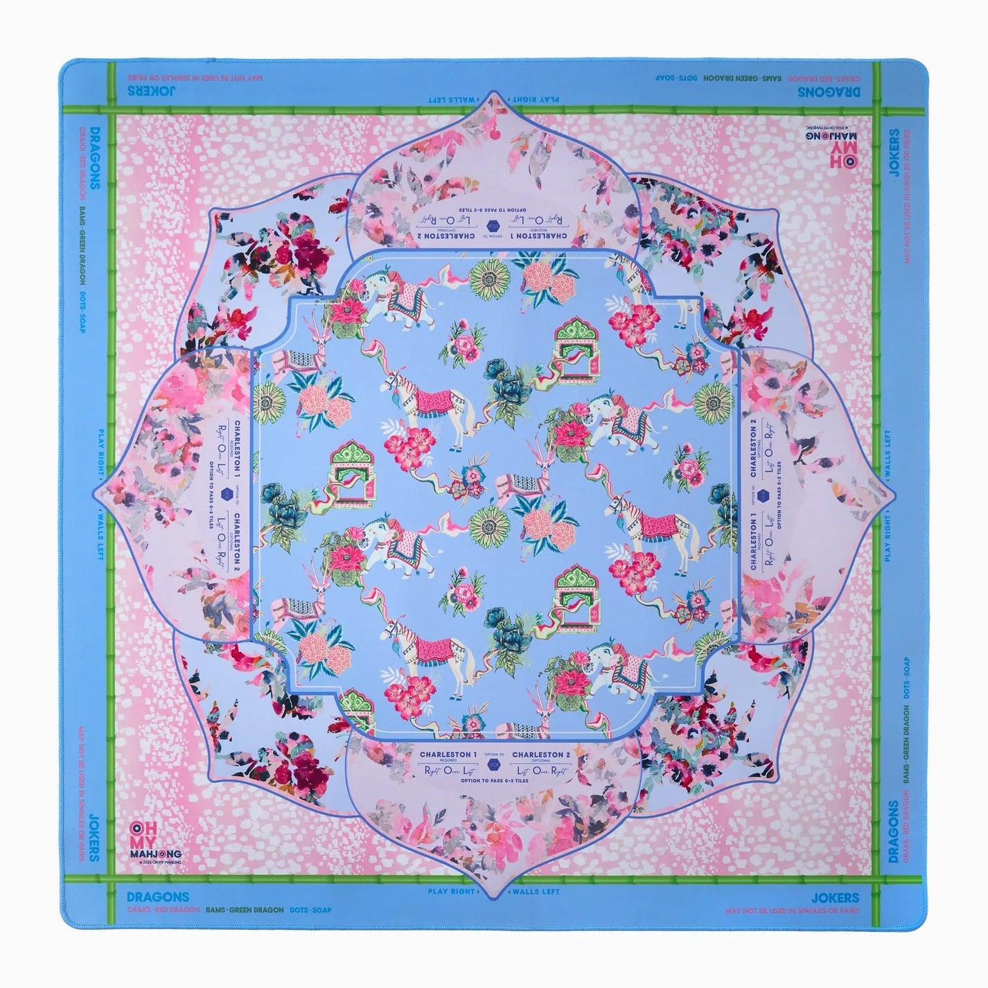 Introducing the Vivara Mat — a vibrant and whimsical celebration of pattern and play, designed for the Mahjong enthusiast who loves bold beauty with a worldly twist. Featuring a charming mix of elephants, blooming florals, and painterly antelope print in shades of soft pinks and layered blues, this mat brings an elevated sense of joy and wanderlust to your game night aesthetic. It’s artful yet playful — a visual escape that feels part garden fête, part global adventure.