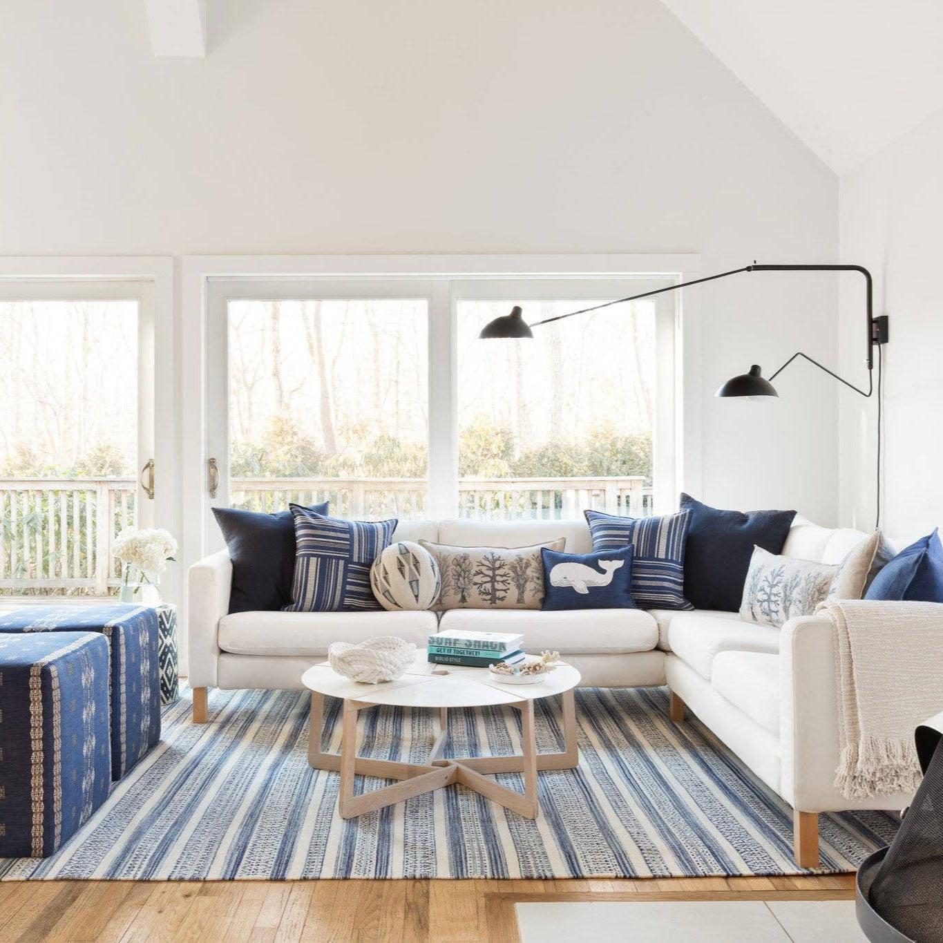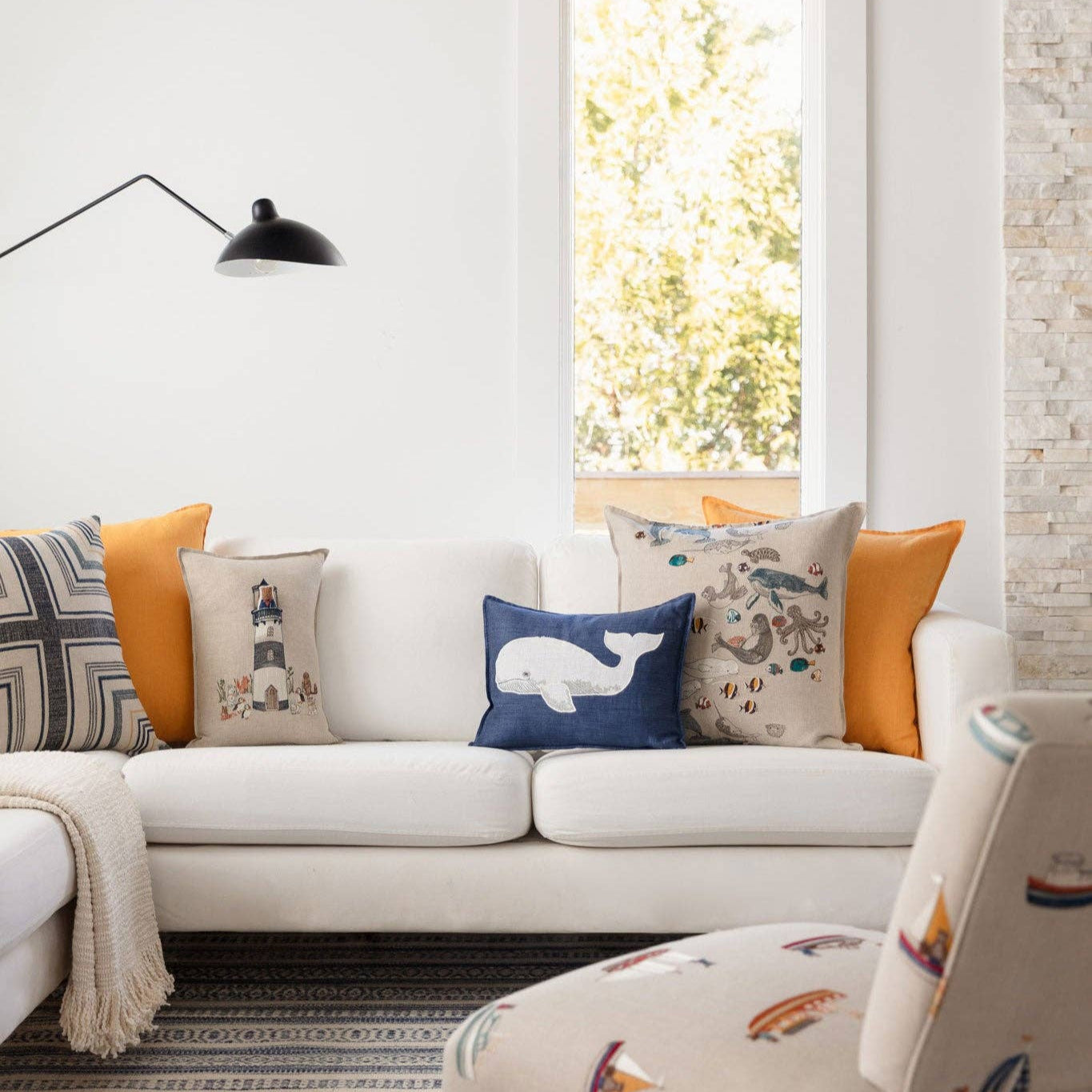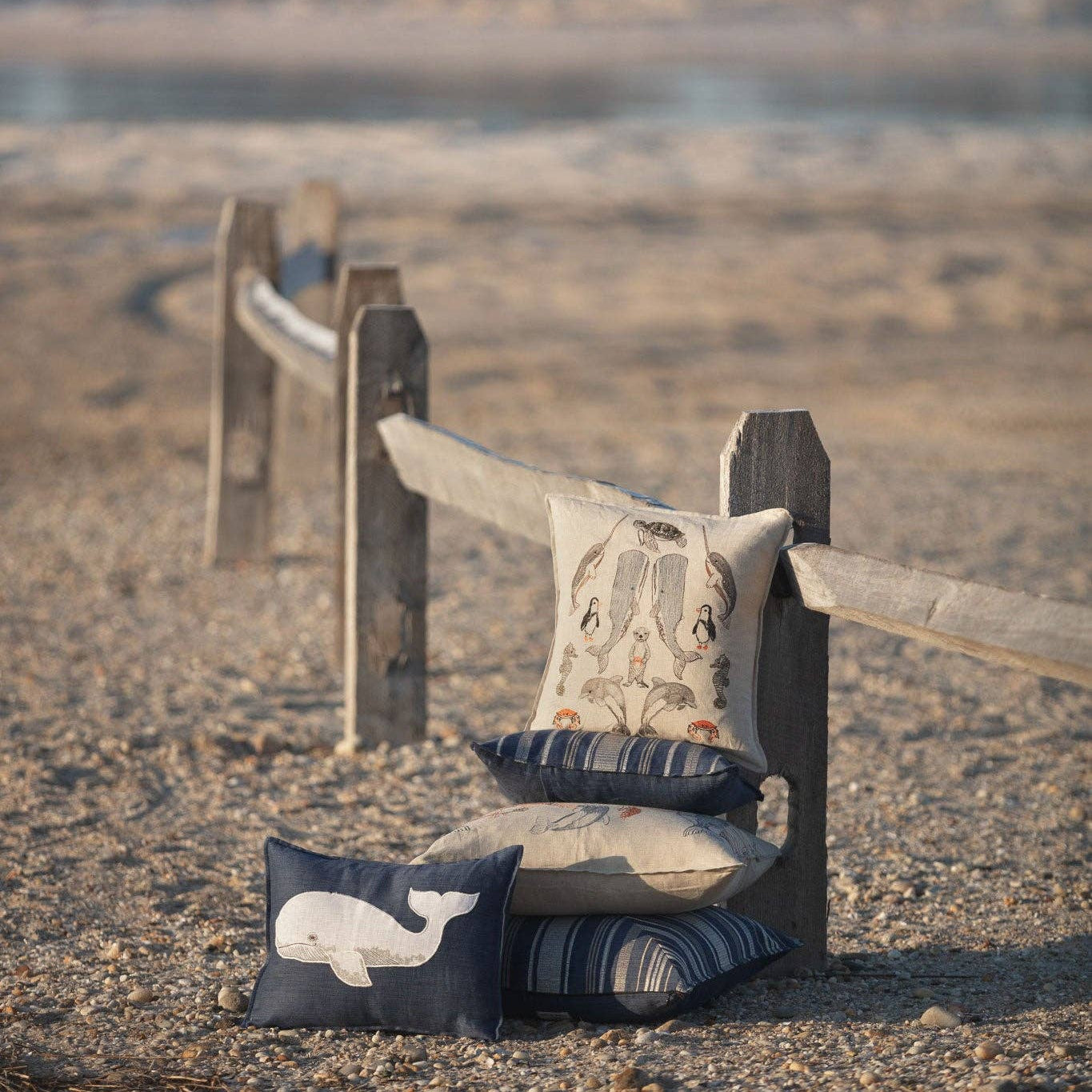 Create a classic coastal look with this great white whale. Our charming whale design is embroidered on white linen and sewn to indigo linen fabric. Measures 12” x 16” With each Coastal design we hope to draw awareness to the unique beauty of the sea and celebrate the diversity of life found in our world’s oceans.